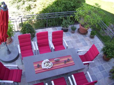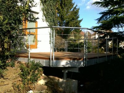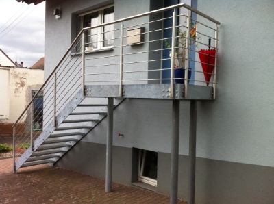 Geländer aus verzinkten Pfosten mit Edelstahlhandlauf und Stahlseilen