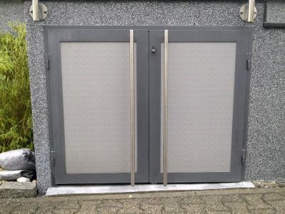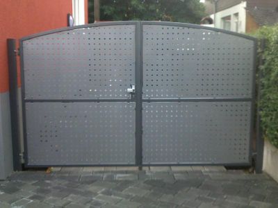 Toranlage mit Elektroantrieb aus Stahl verzinkt und pulverbeschichtet DB 703, in Kombination mit Edelstahllochblechen.Im seitlichen Bereich wurde ein Gehflügel integriert mit Briefkasten und Kommunikations-einheit.