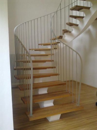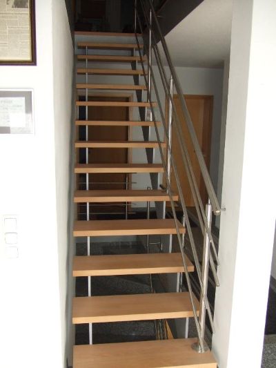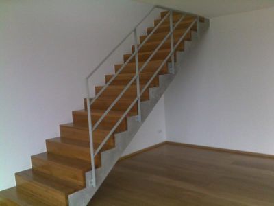 Innengeländer, Füllstäbe direkt in den Stufen eingeschraubt.Die Handläufe wurden vorort gebogen.