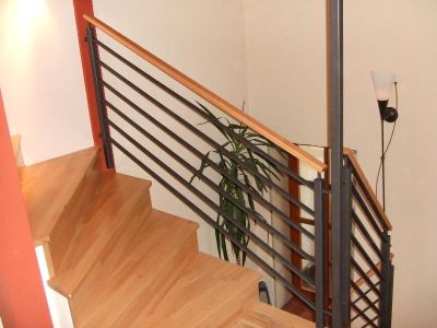 Innengeländer aus Stahl mit Holzhandlauf und kleinem Türchen.