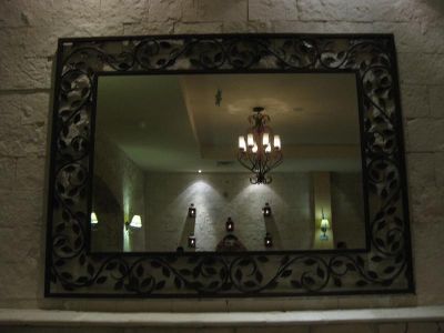 Von Hand geschmiedete Spiegelumrandung aus Vierkantrohr 25 x 25 x 2 mm.Füllung bestehend aus Rundstahl 12 mm zu Ornamenten geschmiedet bzw.gebogen und mit diversen Blättern versehen.