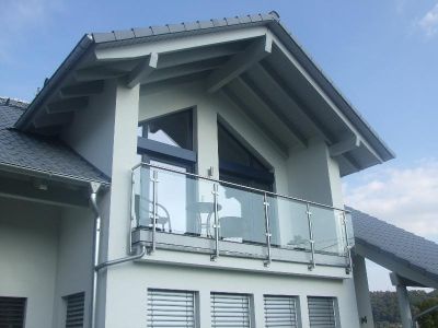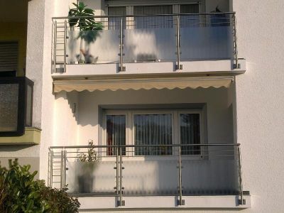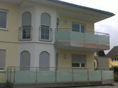 Geländer aus Edelstahl mit Sicherheisglas und mattierter Folie.