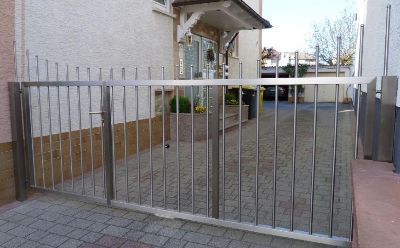 Hoftor mit Gehflügel in Kombination mit Vierkantrohr und Rundrohr. Die Füllstäbe wurden jeweils mit Kugeln bestückt.