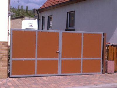 Hoftor aus zwei Flügeln. Rahmen aus Vierkantrohr 60 x 40 x 2 verzinkt und pulverbeschichtet. Die einzelnen Füllungen der Torflügel wurden aus Aluminium Strukturblech angefertigt und pulverbeschichtet.
